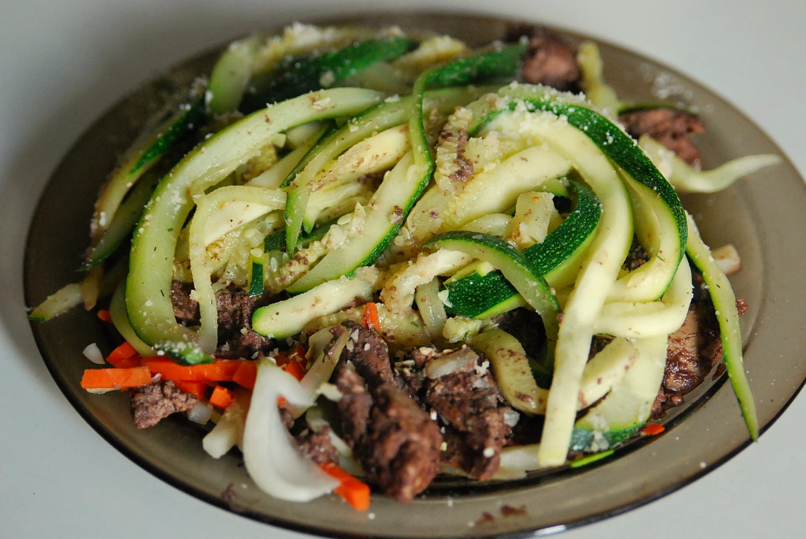 - obiad – makaron z cukinii duszony z marchewką i czosnkiem, wątróbka drobiowa smażona na oleju kokosowym z cebulką (zdjęcie)